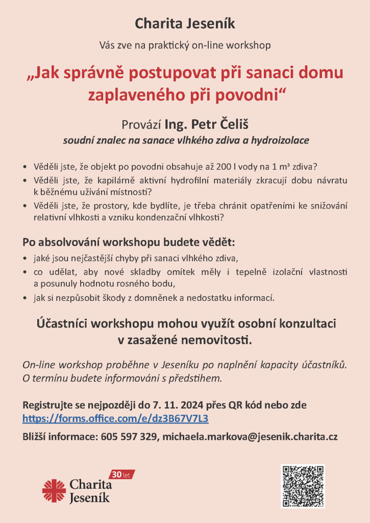 Pro všechny, kterým zářijová povodeň poškodila nemovitosti připravila Charita Jeseník s Ing. Petrem Čelišem, expertem a soudním znalcem v oblasti sanace vlhkého zdiva a hydroizolací staveb.